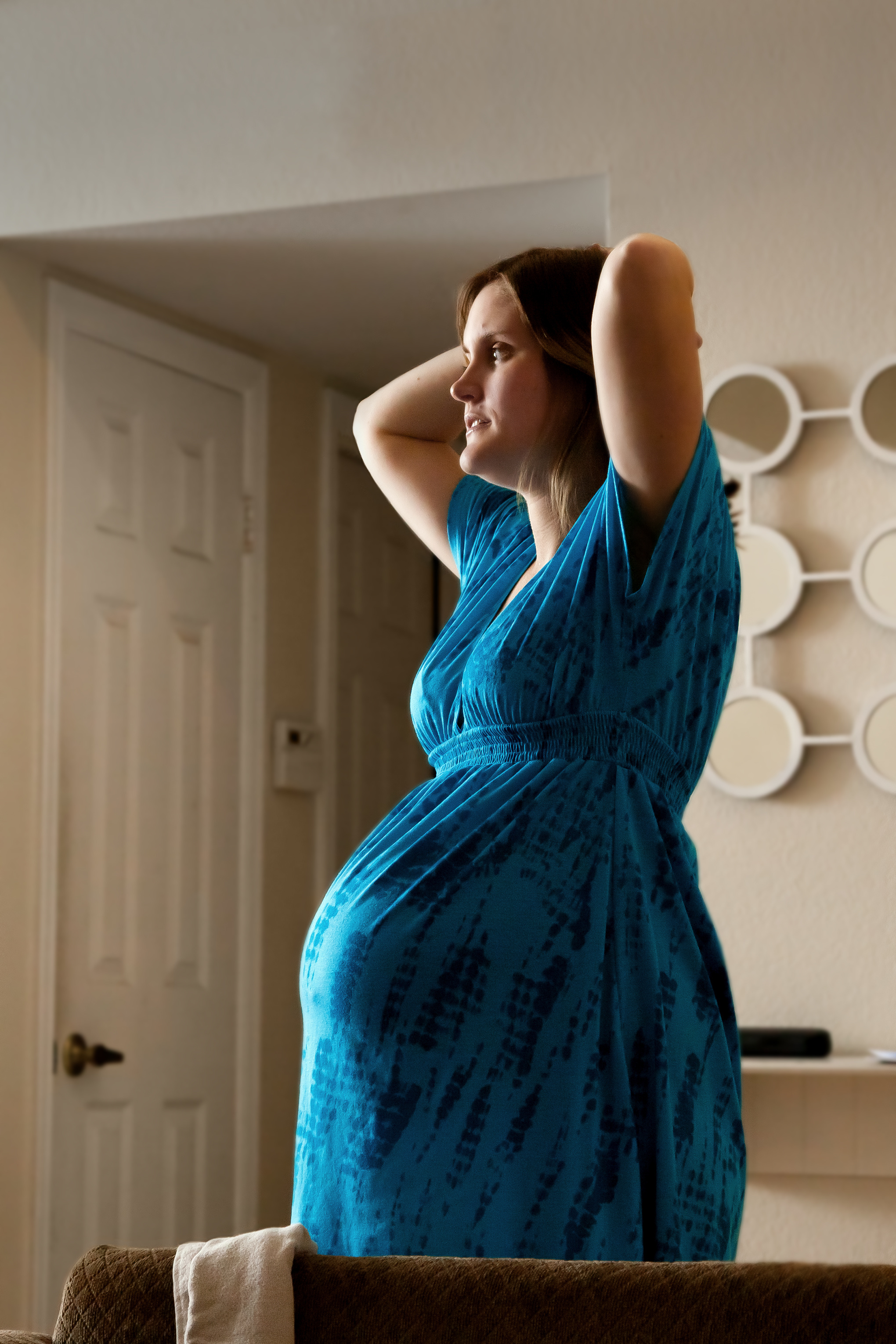 A pregnant woman at the start of her labor stretches for a moment between contractions. She looks a bit nervous about the delivery ahead.